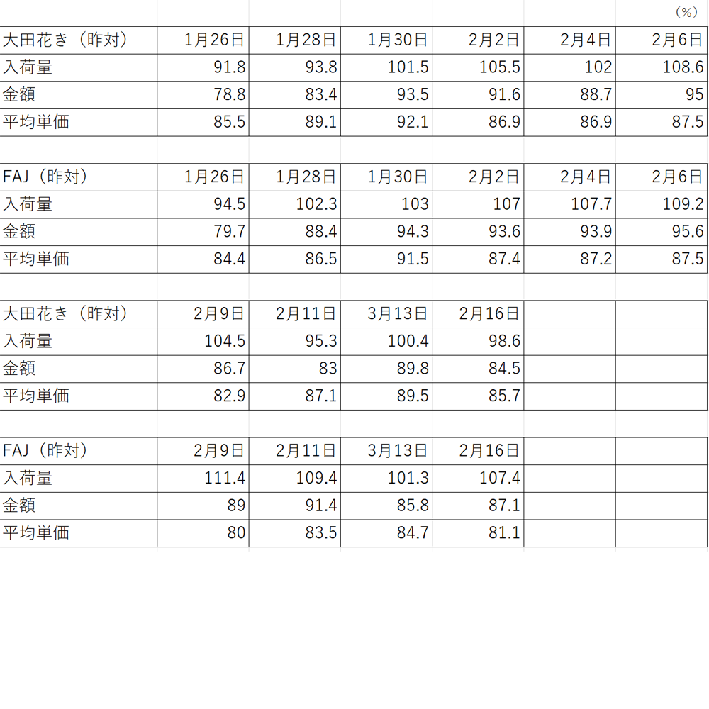 先行きについては、気温の上昇により来週以降は草花類の入荷が増えてくる見通しです。輪菊、バラを含めて全体としては横ばい基調が予想されますが、2月は花保ちが良く引き合いは弱めの状況が続いており、雪の影響も重なって相場の回復には時間を要する可能性があります。なおバレンタイン前日の13日(金)は活況となり、局所的に相場が動く場面も見られました。