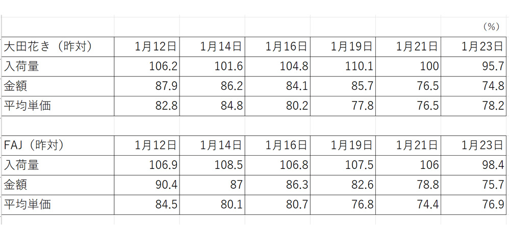 成人式需要は全体的に活況でした。また、1月21日「スイートピーの日」は、スイートピーの引き合いが強まりました。16〜17日の暖かさにより、路地栽培品目が一時的に増加し、21日(水)以降は相場下落傾向。