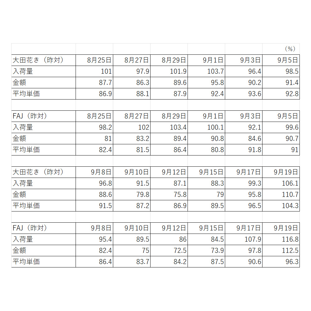 敬老の日~彼岸前半は台風リスクと高温により、警戒感の強い仕入れとなり盛り上がりは限定的。9/22以降の気温低下を契機に需要は回復し、洋花のいけ込み・イベント需要が活発化。カボチャ(ハロウィン)、ブライダル案件も動意強。